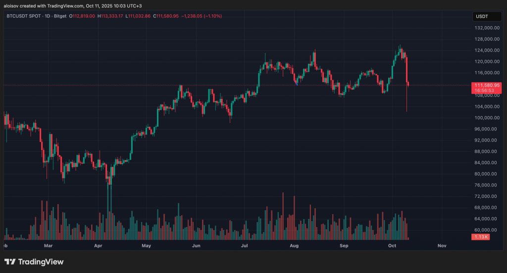 Реакция криптовалютного рынка оказалась мгновенной и разрушительной. 10 октября биткоин упал до $102 173 на бирже Binance — снижение на 19% от исторического максимума, установленного 6 октября. На момент написания статьи цена восстановилась до $111 580.