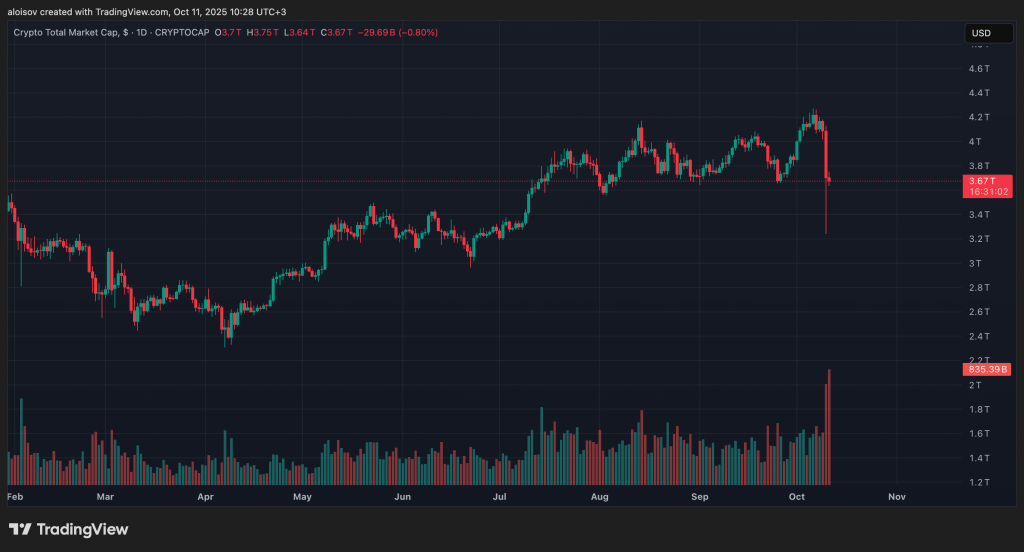 За 24 часа объем ликвидаций на крипторынке достиг $19,31 млрд по данным CoinGlass. Биткоин и Ethereum потеряли 15-20% за ночь. Общая капитализация рынка сократилась на $900 млрд от пика до минимума дня, причем $500 млрд испарились всего за 10 минут.