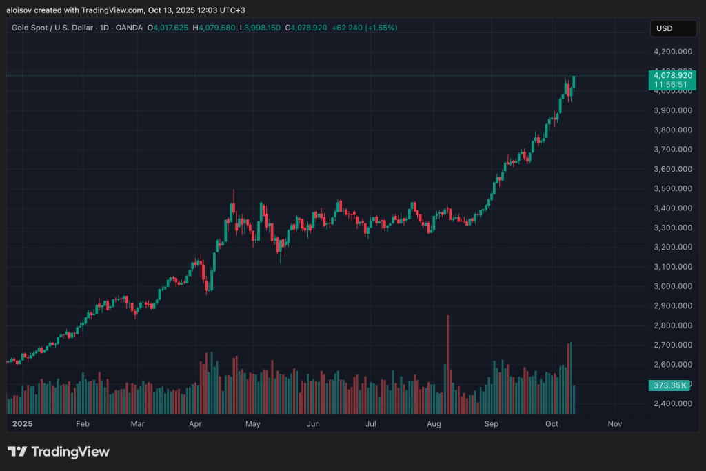 Паника охватила не только криптовалюты — даже акции и золото попали под раздачу. Впрочем, к 13 октября золото уже обновило исторический максимум, достигнув $4 078 за унцию. А S&P 500 отыграл половину падения конца прошлой недели.