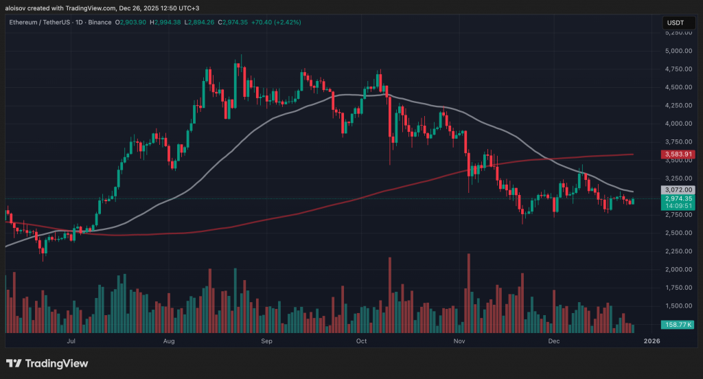 Напомним, Ethereum обновил свой исторический максимум 24 августа, но затем начался нисходящий тренд. В ноябре криптовалюта просела до $2 623, и сейчас торгуется около $2 974. Возврат к историческому максимуму означал бы рост на 40% — звучит заманчиво, но аналитик настроен скептически.