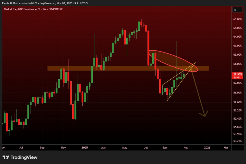Доминирование биткоина демонстрирует медвежьи сигналы уже несколько недель, что может указывать на приближение сезона альткоинов раньше, чем ожидают многие трейдеры. Об этом заявил криптоаналитик Мэтью Хайленд (Matthew Hyland) в соцсети X.