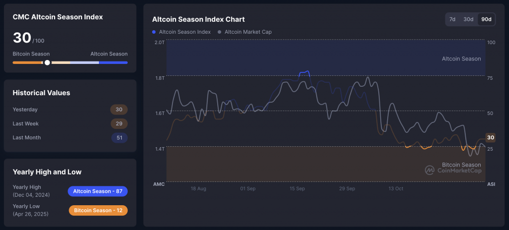 Несмотря на уверения Хайленда о том, что рынок альткоинов может вскоре набрать обороты, индекс сезона альткоинов CoinMarketCap в настоящее время находится на отметке 30 из 100, что указывает на «сезон биткоина». Последний раз индикатор показывал «сезон альткоинов» 8 октября, всего через несколько дней после того, как биткоин достиг нового исторического максимума $125 100, когда трейдеры ожидали ротацию капитала.