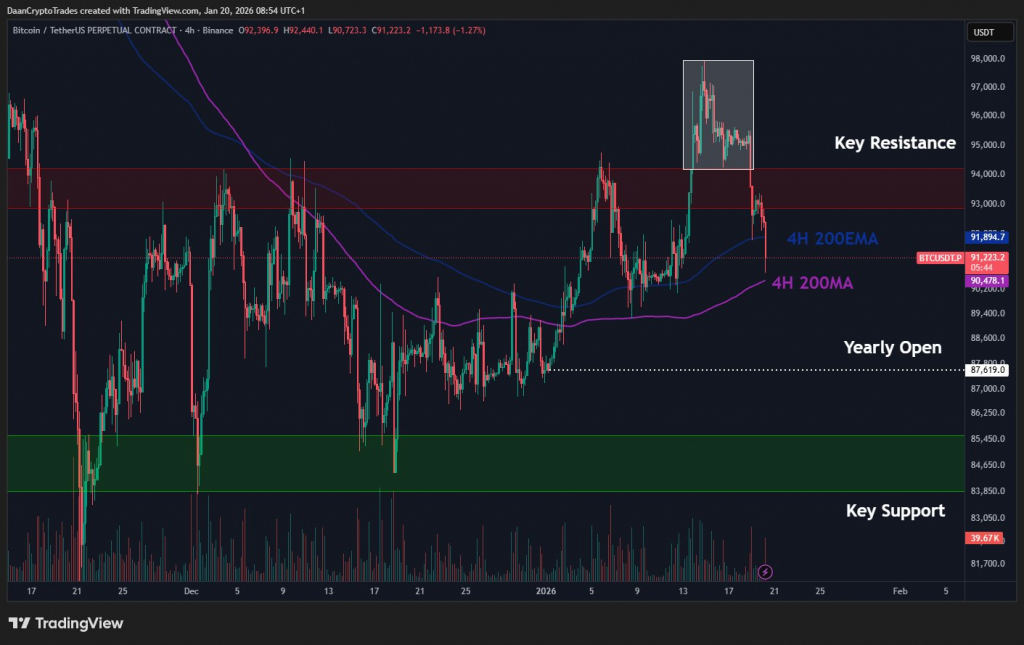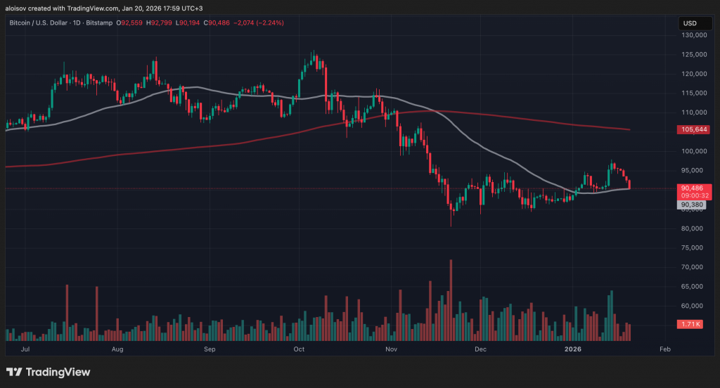 Биткоин приблизился к восьмидневному минимуму на уровне $90 000 20 января, когда макроэкономические факторы создали новые проблемы для быков. Волатильность объясняется комбинацией геополитических и макроэкономических факторов, главным из которых стало возобновление торговой войны между США и ЕС, вызванное новой риторикой президента США Трампа о контроле США над Гренландией.