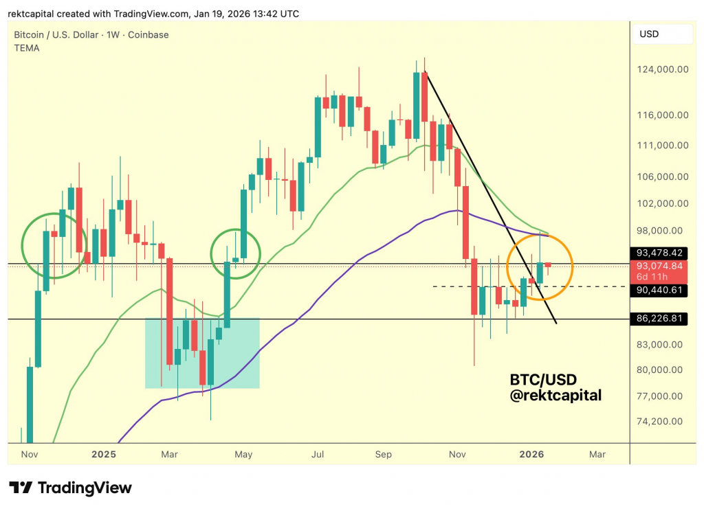 Трейдер и аналитик Rekt Capital сосредоточился на начале 2025 года на отметке $93 500 — уровне, который имел ключевое значение для недельного графика.