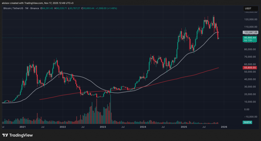 Биткоин продолжил падение на прошлой неделе, потеряв почти все прибыли текущего года. Снижение на 27% от недавних максимумов привело к пробою 50-недельной скользящей средней — важного технического ориентира для среднесрочного тренда. Недельное закрытие под отметкой $100 000 стало первым с 4 мая, что усилило осторожные настроения на рынках цифровых активов.