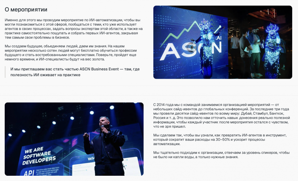 ASCN Business Event — это возможность увидеть реальные кейсы внедрения ИИ в бизнес, протестировать платформу ASCN.ai и сразу применять решения для автоматизации лидогенерации, маркетинга и продаж. Каждый участник получает инструменты для роста дохода, экономии ресурсов и повышения эффективности процессов.