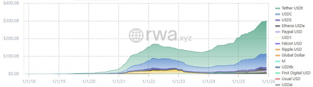 Между тем, общая рыночная капитализация стейблкоинов достигла рекордного уровня и составляет чуть более $300 млрд, согласно данным RWA.xyz. С начала этого года она выросла на 48%, а Tether остается доминирующим эмитентом с долей рынка в 63%. Рынки стейблкоинов продемонстрировали значительный рост в 2025 году, и Tether сохраняет свое доминирование.