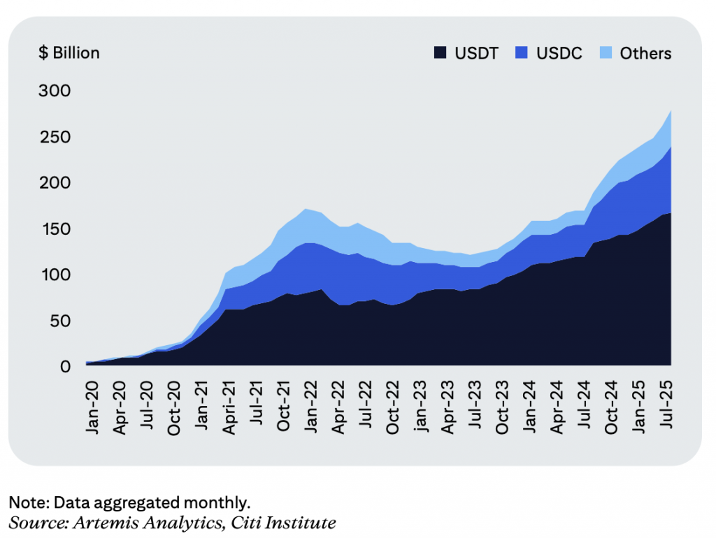 Динамику предложения стейблкоинов отражает и отчёт Citi GPS «Стейблкоины-2030»: по данным Artemis Analytics и Citi Institute, предложение USDT к середине 2025 года превысило $185 млрд, тогда как объём USDC составил около $80 млрд. Остальные стейблкоины держатся на уровне около $45 млрд. Все три сегмента демонстрируют устойчивый восходящий тренд с 2020 года.