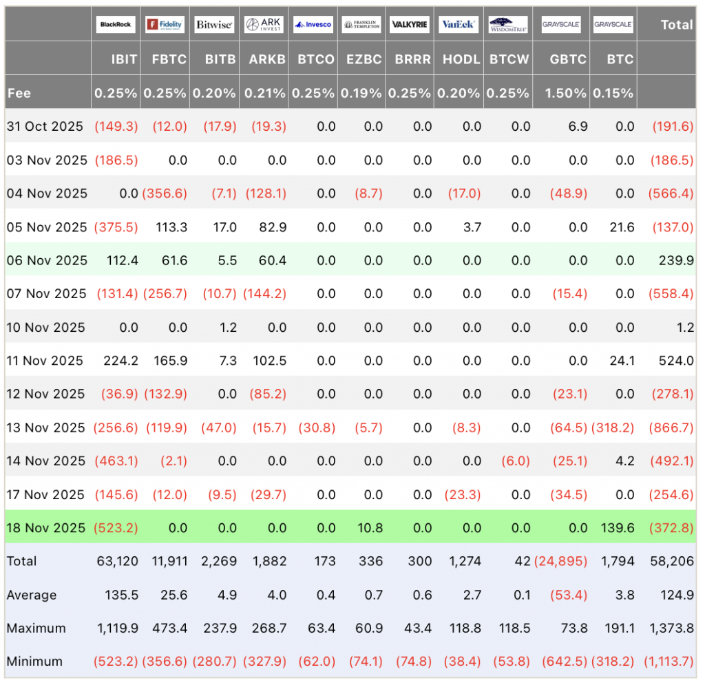 Отток 18 ноября в $523 млн из IBIT перевесил приток в фонды Grayscale и Franklin Templeton, что привело к чистому оттоку в $372,7 млн по всем спотовым биткоин-ETF за день.
