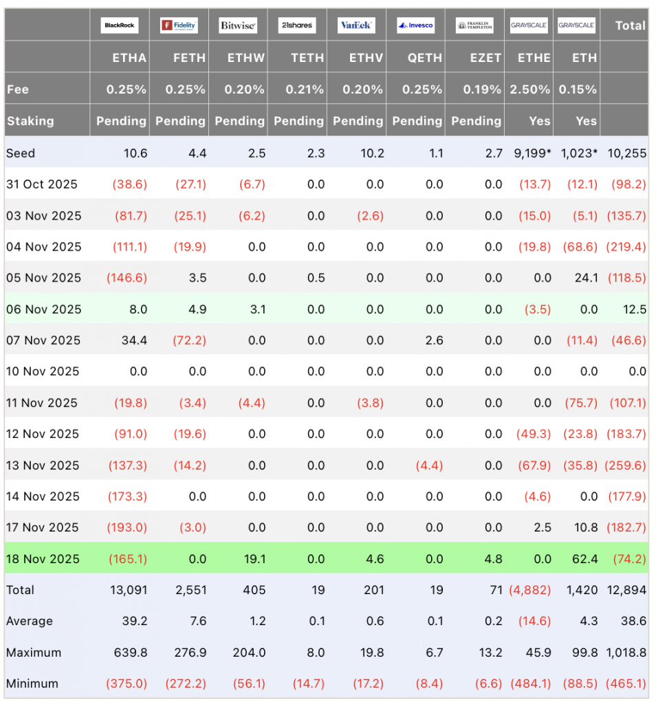 Спотовые Ethereum-ETF продемонстрировали схожую картину. ETHA от BlackRock зафиксировал $165 млн чистого оттока, перекрыв совокупный приток в $91 млн в фонды от Grayscale, Bitwise, VanEck и Franklin Templeton.