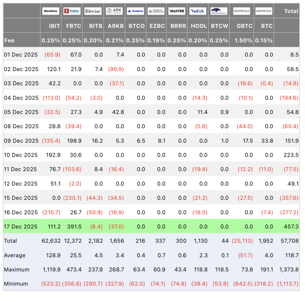 17 декабря спотовые биржевые фонды биткоина зарегистрировали чистый приток в размере $457 млн — это самый крупный однодневный показатель за последний месяц. Институциональный спрос показал признаки нового ускорения после периода неопределенности.