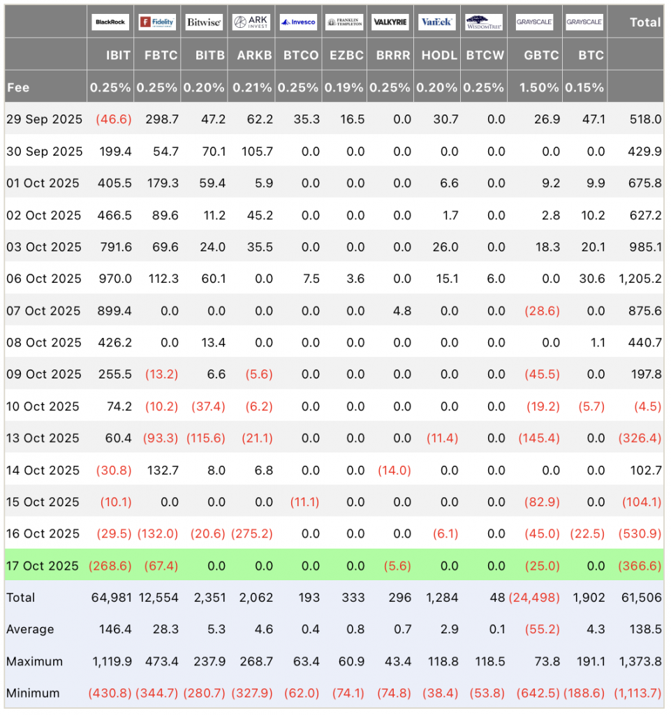 11 спотовых биткоин-ETF в США зафиксировали совокупный отток $366,6 млн 17 октября, что стало финальным аккордом провальной недели для институциональных инвестиционных продуктов на базе биткоина.