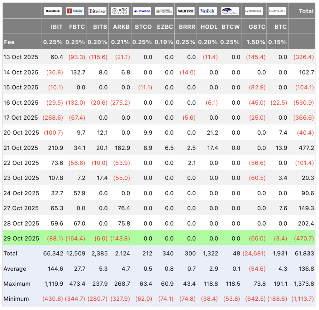 29 октября американские спотовые биткоин-фонды потеряли $470 млн, что стало самым значительным оттоком за двухнедельный период. Лидером исхода стал FBTC от Fidelity с $164 млн, за ним последовал ARKB от ARK Invest с оттоком в $143 млн. Тройку замыкает IBIT от BlackRock с $88 млн.