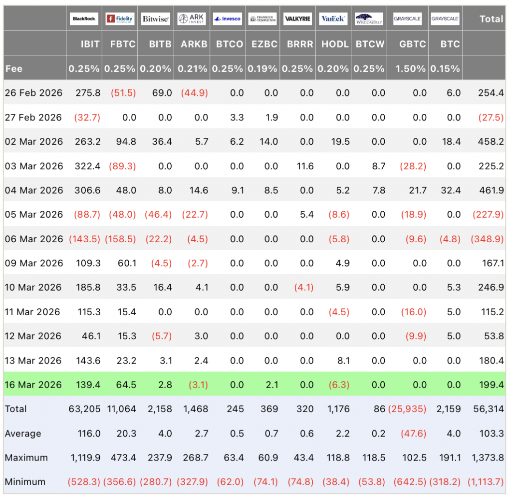По данным Farside Investors, 16 марта чистый приток в спотовые биткоин-ETF на американских биржах составил $199,4 млн. Лидерами стали iShares Bitcoin Trust от BlackRock (IBIT) и Fidelity Wise Origin Bitcoin Fund — они привлекли $139,4 млн и $64,5 млн соответственно. Bitwise Bitcoin ETF и Franklin Bitcoin ETF добавили скромные $2,8 млн и $2,1 млн, тогда как VanEck Bitcoin ETF и ARK 21Shares Bitcoin ETF зафиксировали отток: $6,3 млн и $3,1 млн.