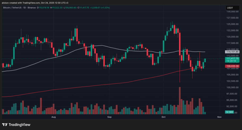 Биткоин преодолел отметку $111 000 на бирже Binance, продемонстрировав рост на 7,5% с минимума 17 октября. Этот подъем происходит в ключевой момент, когда рынок ожидает важные макроэкономические данные и анализирует технические сигналы для дальнейшего движения.