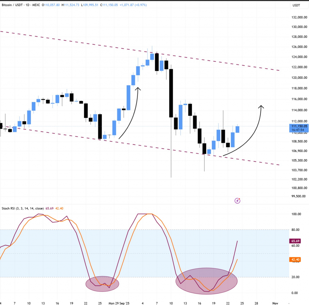 Технические индикаторы также подают обнадеживающие сигналы. Трейдер BitBull отмечает, что стохастический RSI указывает на формирование дна — такая же модель наблюдалась перед ростом биткоина до нового исторического максимума в первую неделю октября. Повторение этого паттерна может свидетельствовать о готовности рынка к новому импульсу роста.