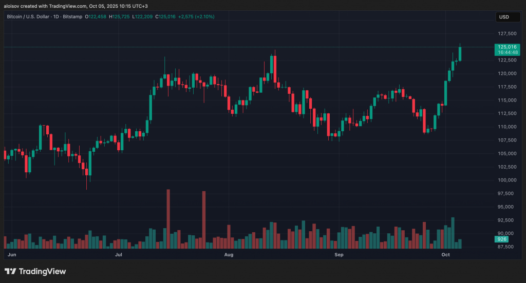 Биткоин обновил исторический максимум, достигнув отметки $125 727 на бирже Bitstamp 5 октября. На момент написания материала первая криптовалюта торговалась на уровне $125 016, закрепляя позиции выше предыдущего рекорда.