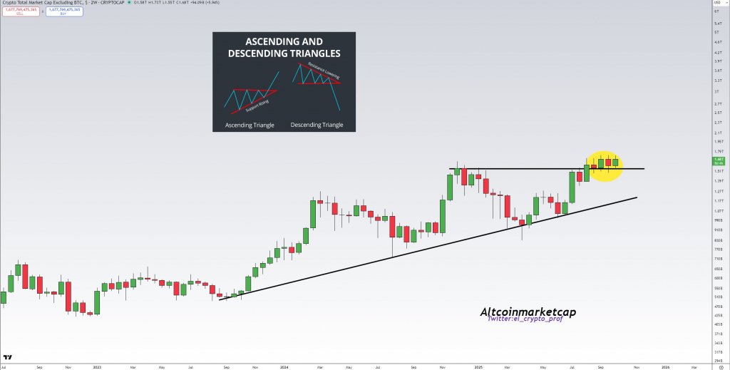 Трейдер и аналитик Moustache предположил скорое начало сезона альткоинов, сравнимого с 2017 и 2021 годами. В качестве аргумента он указал на индекс TOTAL2, который консолидируется выше исторических максимумов 2021 и 2024 годов уже восемь недель. Аналитик напомнил о важном правиле: чем дольше консолидация, тем сильнее поддержка.