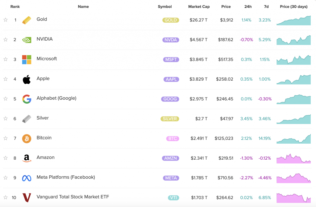 Аналитический ресурс The Kobeissi Letter сообщил, что биткоин официально стал активом с капитализацией $2,5 трлн, заняв седьмое место среди самых ценных активов в мире.