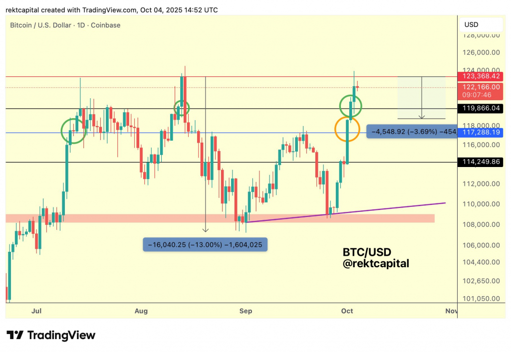 Аналитик Rekt Capital также опирается на исторические аналогии для прогноза будущей динамики BTC. По его мнению, для уверенного преодоления уровня $124 000 может потребоваться время. «Неудивительно, что биткоин отскочил от ~$124 000 при первой попытке в этом восходящем тренде. В конце концов, в последний раз, когда биткоин откатился от $124 000, последовала коррекция на 13%, — рассуждает он. — Биткоину нужно доказать, что сопротивление $124 000 ослабло. И любая более мелкая просадка или откат здесь именно это и продемонстрирует».