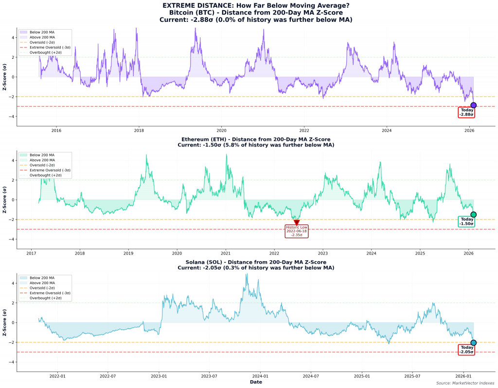Анализ относит обвал этой недели к 15 самым быстрым в истории биткоина: BTC/USD упал более чем на 22% за одну неделю, что хуже, чем в 98,9% случаев за всю его историю. При этом отклонение в 2,88 стандартных отклонения ниже 200-дневной скользящей средней превзошло просадки крупных альткоинов Ethereum и Solana.