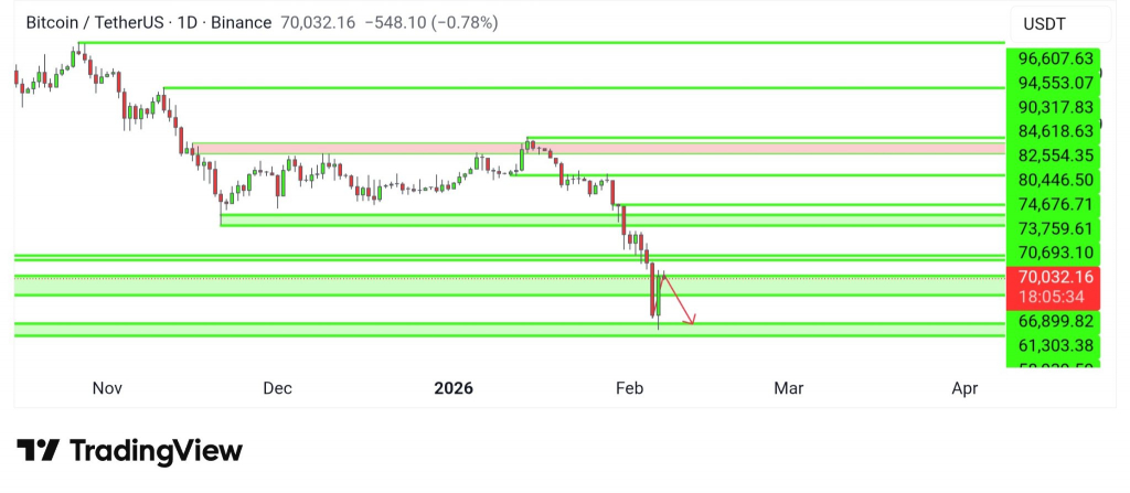 Ключевой момент, который остается открытым: неспособность биткоина закрепиться выше $71 000 на дневном таймфрейме может указывать на то, что крупные держатели пока не готовы поддерживать цену на этих уровнях. Первая в истории красная свеча на $10 000 — это не просто статистика, а свидетельство того, что динамика рынка качественно изменилась.