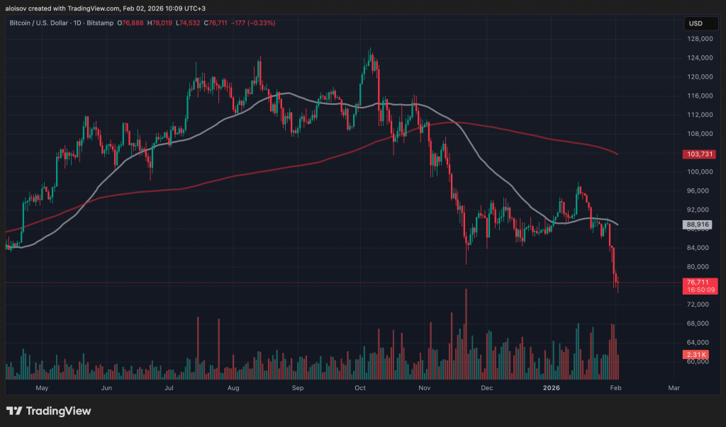 Биткоин упал ниже $75 000, что побуждает аналитиков говорить о продолжении медвежьего тренда и оценивать глубину дальнейшего падения.