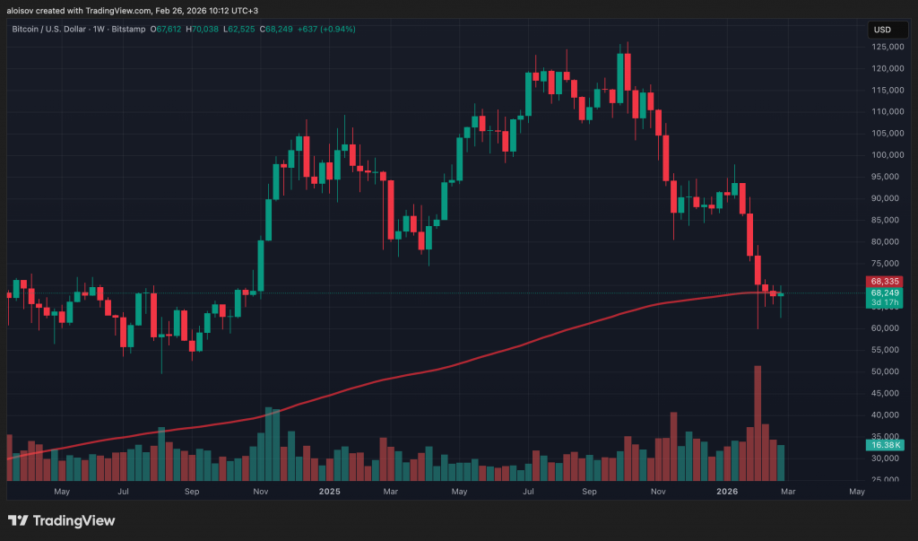 После продолжительного давления продавцов BTC/USD вернулся к 200-недельной экспоненциальной скользящей средней (EMA), которая сейчас находится на уровне $68 355. Потеря этого уровня как поддержки исторически совпадала с переходом рынка в медвежью фазу. Трейдер и аналитик Rekt Capital повторил свой февральский тезис: недельная свеча должна закрыться выше 200-недельной EMA — иначе восстановление рискует оказаться ненадежным.