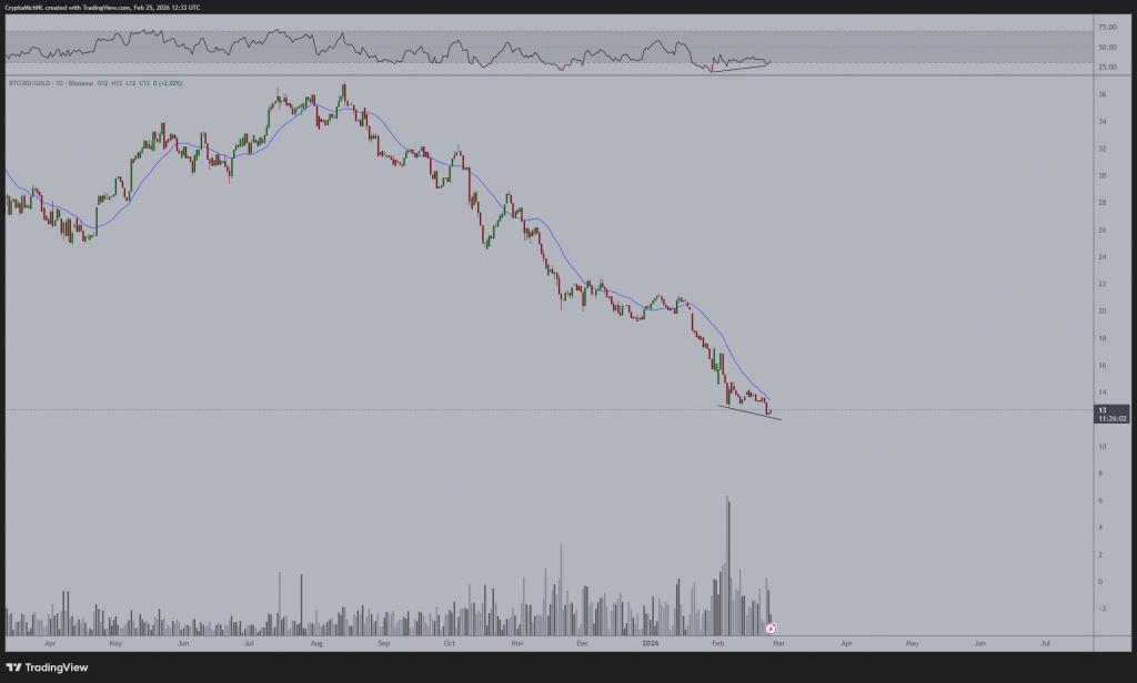 Золото торгуется выше $5 000 за унцию, и трейдер и аналитик Михаэль ван де Поппе (Michaël van de Poppe) указал на формирующуюся бычью дивергенцию индикатора относительной силы (RSI) на дневном графике пары BTC/GOLD. «Дивергенция пока не подтверждена, но с учетом силы биткоина сегодня и вчера я думаю, что начинается небольшая ротация. Самое время», — написал он подписчикам в соцсети X.
