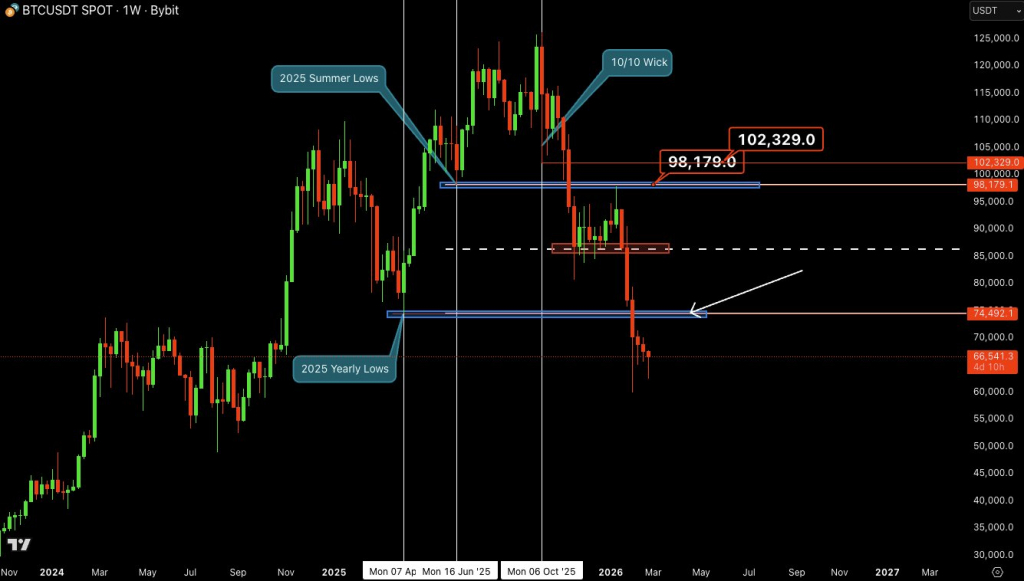 Трейдер Castillo Trading смотрит на более высокие цели. По его оценке, при сохранении текущего уровня поддержки ориентир для движения вверх — около $74 492, что соответствует минимуму 2025 года. «Хороший старт отскока. Если поддержка сохранится, интересной точкой для переоценки станет уровень годового минимума 2025 года в области $74 492», — написал он в соцсети X.