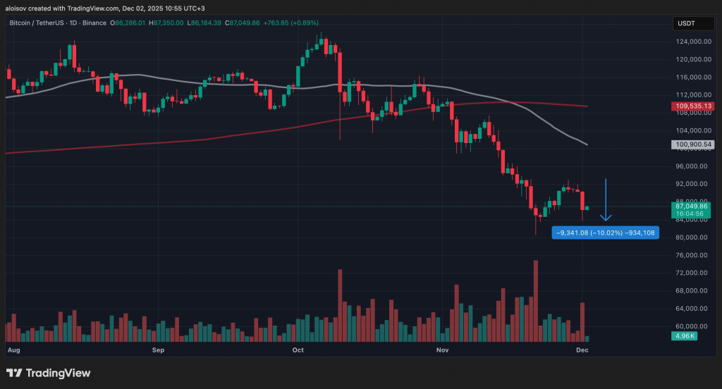Биткоин опустился ниже $83 000 в течение первых суток декабря, продолжив коррекцию последних дней. Падение основной криптовалюты за четверо суток составило 10%, что вынудило аналитиков провести ревизию краткосрочных прогнозов и определить новые ключевые уровни поддержки.