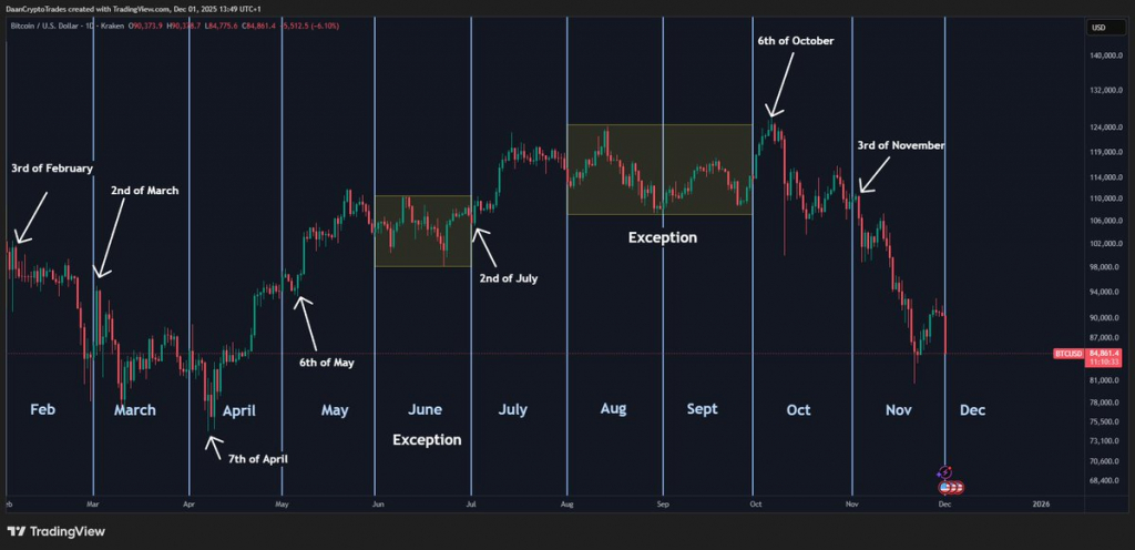 Трейдер Daan Crypto Trades обратил внимание на особенности поведения биткоина в начале последнего месяца года. Он напомнил, что в 80% случаев первое движение месяца формирует его максимум или минимум в течение первых 12 дней.