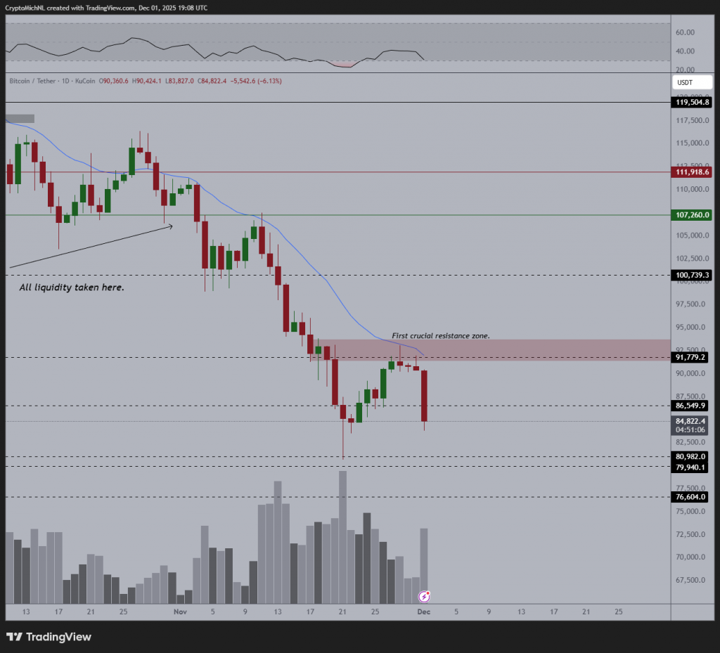 Более детальный сценарий развития событий представил криптотрейдер и аналитик Михаэль ван де Поппе (Michaël van de Poppe). Он указывает на важность реакции цены при тестировании минимума на уровне $83 400. Если этот уровень не обеспечит достаточного давления покупателей, то следующей целью станет область ниже $81 000. Такое развитие событий аналитик ожидает в ближайшие дни.