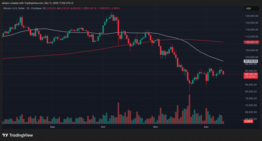 Биткоин упал до $89 418 на бирже Binance, что соответствует снижению цены на 5,44% с 9 декабря, когда актив поднялся до $94 640. Это произошло после того, как Федеральная резервная система США в третий раз подряд снизила ключевую ставку на 25 базисных пунктов.