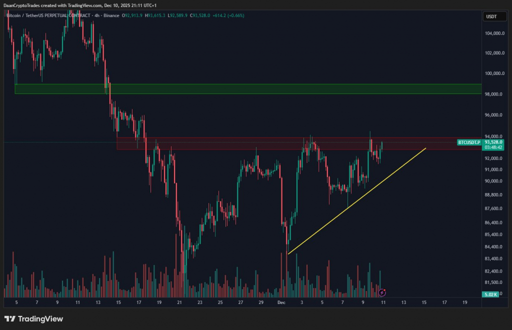 Трейдер Daan Crypto Trades указал на консолидацию биткоина в восходящем треугольнике последние несколько недель. Пробой и удержание выше $94 000 должны привести к движению для повторного тестирования предыдущей зоны поддержки около $98 000, где также сосредоточен значительный объем ликвидности.