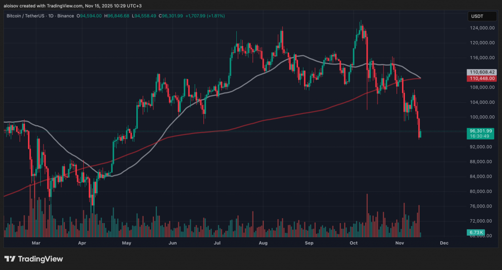 Биткоин опустился до $94 000 на бирже Binance, зафиксировав падение на 25,5% от исторического максимума, достигнутого 6 октября. За последние сутки первая криптовалюта подешевела на 5,1%, что привлекло внимание аналитиков к текущему состоянию рынка и возможным сценариям развития событий.
