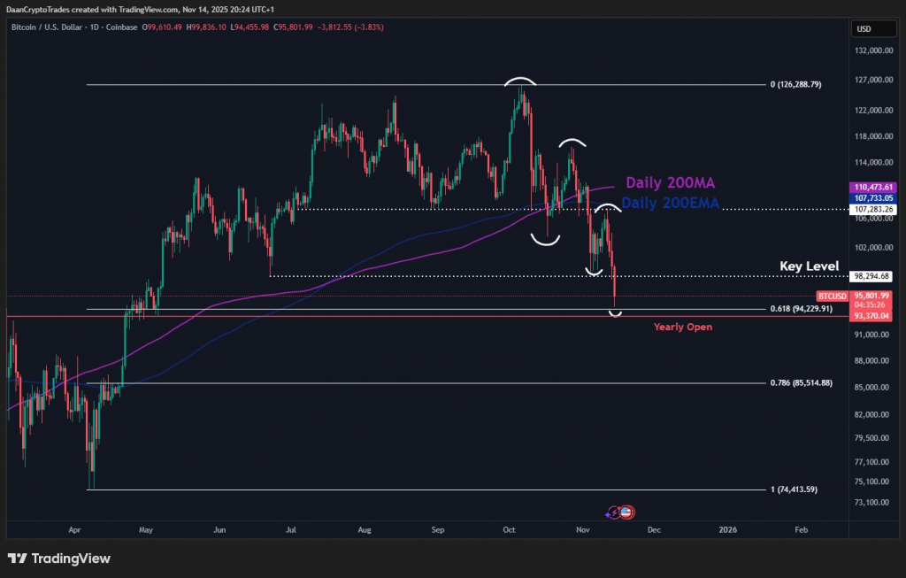 Трейдер Daan Crypto Trades обращает внимание на то, что биткоин протестировал уровень коррекции Фибоначчи 0,618 и опустился немного ниже уровня начала года. Этот уровень представляет последнюю значимую поддержку перед отметкой $86 000. Для восстановления бычьих настроений необходимо защитить текущий уровень и вернуться выше $98 000.