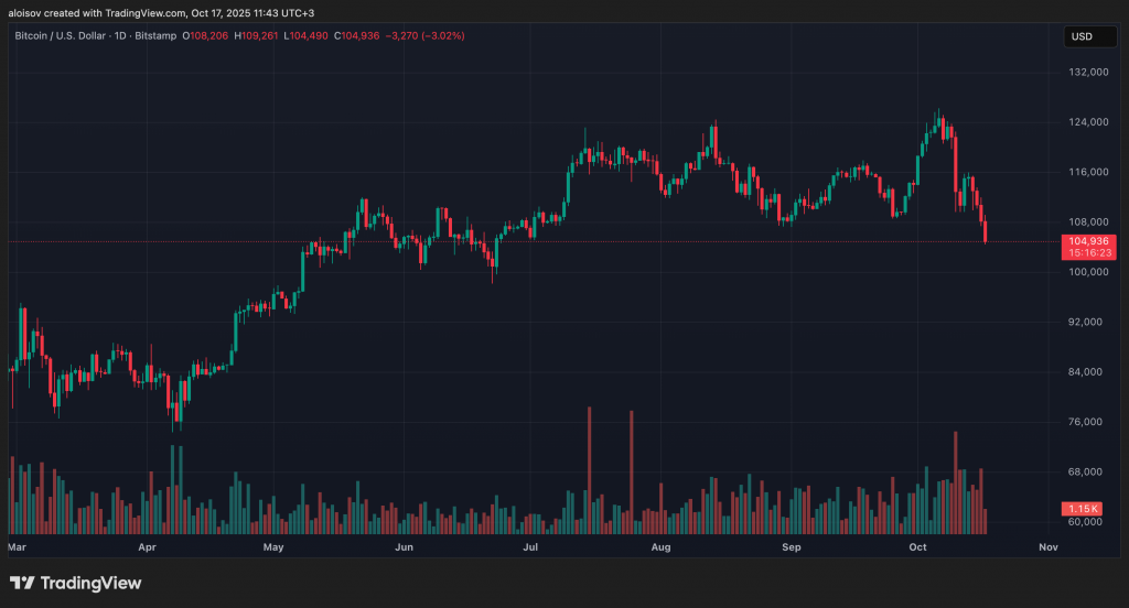 17 октября цена биткоина обвалилась до $104 409, показав худший результат за последние 15 недель: впервые с июня главная криптовалюта опустилась ниже $106 000.