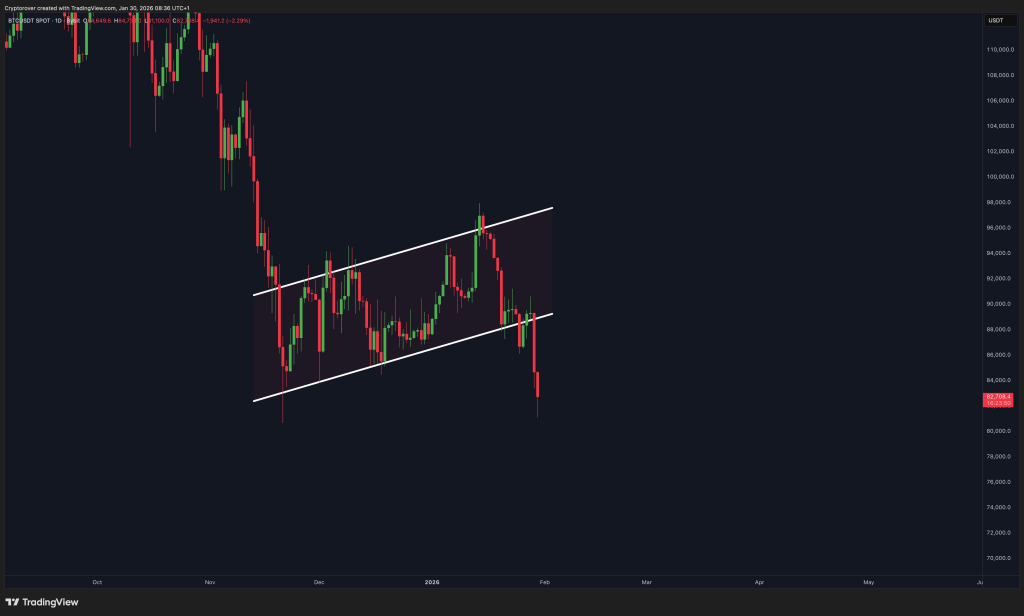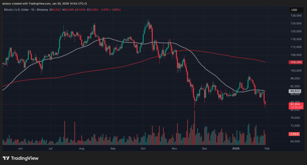 Биткоин обрушился до $81 040 на бирже Bitstamp, что составляет падение на 35% от исторического максимума, зафиксированного 6 октября 2025 года. С 29 января цена снизилась на 9%, а биткоин выпал из топ-10 активов по рыночной капитализации.