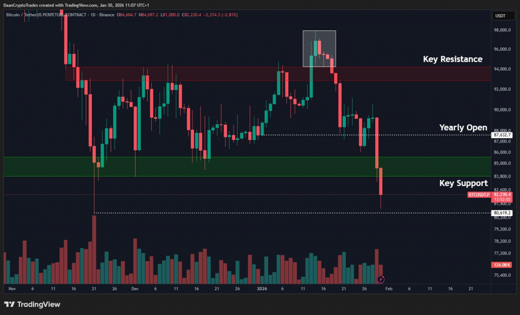 Трейдер Daan Crypto Trades отметил, что биткоин пробил основной уровень поддержки, однако ноябрьский минимум пока остается нетронутым. Аналитик рассчитывает на возможную стабилизацию цены без сильного продолжения падения.