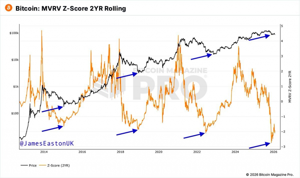 Несмотря на негативные настроения, некоторые аналитики видят признаки приближения к дну медвежьего рынка. Михаэль ван де Поппе (Michaël van de Poppe) отметил, что текущий Z-Score биткоина — индикатор, показывающий отклонение цены от средних значений — ниже значений, зафиксированных во время дна медвежьих рынков 2015, 2018, 2020 и 2022 годов. По его словам, это свидетельствует о том, насколько глубоко рынок находится в медвежьей фазе, и указывает на близость к завершению цикла.
