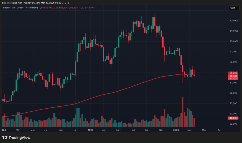 Биткоин опустился 27 марта ниже $66 000, присоединившись к общей волне снижения рисковых активов на фоне нарастающих опасений относительно инфляции в США и продолжающегося нефтяного шока из-за закрытия Ормузского пролива.