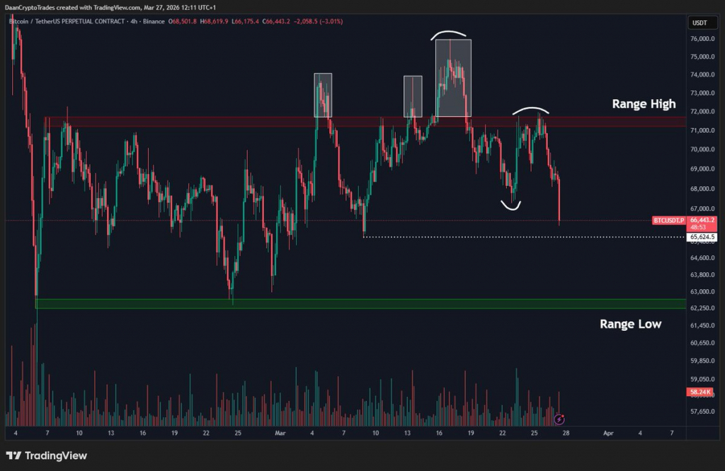 Трейдер Daan Crypto Trades обращает внимание на минимум прошлой недели в районе $65 600 как на ключевой уровень. По его словам, рынок продолжает сбрасывать риск в преддверии выходных — эта закономерность воспроизводится уже несколько недель подряд.