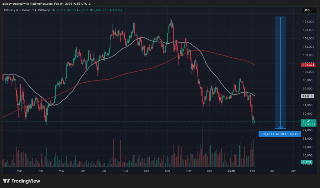 Во вторник, 3 февраля, курс биткоина снизился до $72 863, зафиксировав падение на 42% по сравнению с октябрьским историческим максимумом.