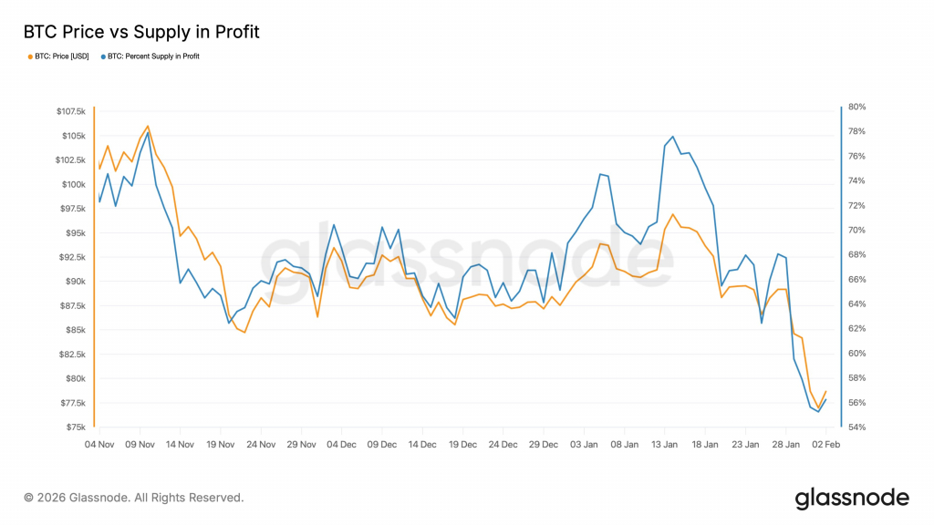 Около 44% всех держателей биткоина находятся в убыточных позициях, сообщает трейдер BitBull. За последний месяц цена упала с $108 000 до $76 000 — падение составило 30%. При этом доля прибыльных позиций снизилась с 78% до 56%.