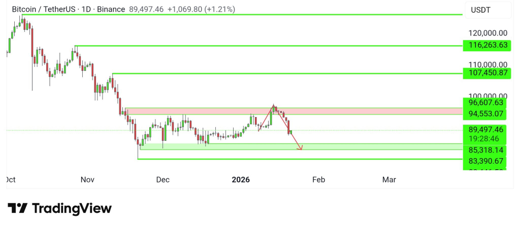 «Если прорыв провалился, то мы можем увидеть биткоин в зоне $83 000-85 000», — предупреждал трейдер ранее. Теперь биткоин направляется именно туда. При сохранении текущего импульса криптовалюта может достичь $85 000 или более низких уровней в ближайшие дни. Медвежий сценарий остается актуальным, пока цена находится ниже диапазона $94 000-96 000.