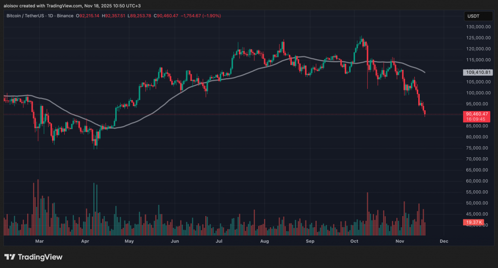 Аналитический ресурс The Kobeissi Letter подтвердил потерю ключевого уровня поддержки, отметив, что биткоин впервые за семь месяцев торгуется ниже $90 000.