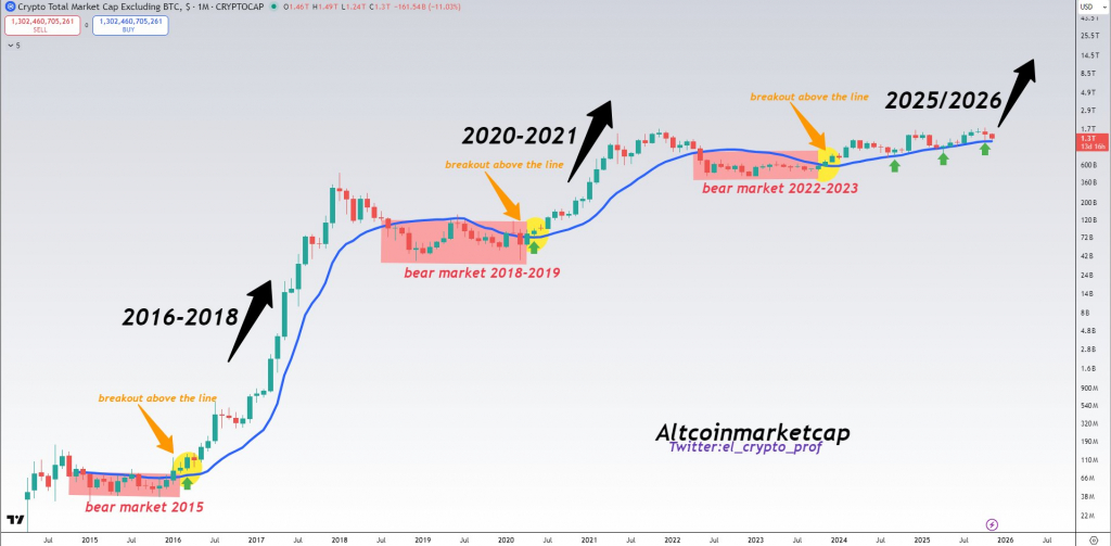 Несмотря на общее падение рынка, трейдер и аналитик Moustache указал на важный технический аспект для альткоинов. По его данным, индекс TOTAL2, отражающий капитализацию альткоинов, продолжает торговаться выше линии бычьего тренда, которая действует уже более 10 лет. Аналитик подчеркивает, что рынок не находится в медвежьей фазе.
