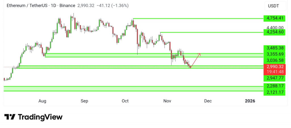 Крупнейшая криптовалюта достигла минимума в $89 253 на бирже Binance, зафиксировав падение на 29% от исторического максимума, достигнутого 6 октября. Ethereum также опустился до $2 946, продемонстрировав общую слабость криптовалютного рынка.
