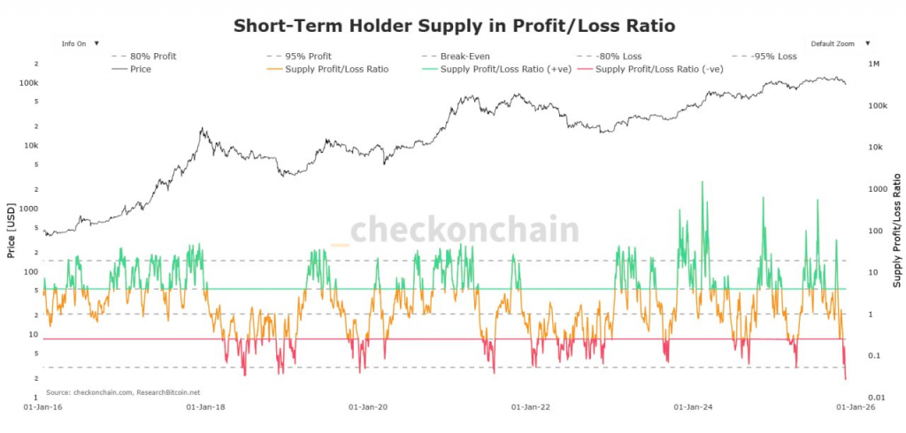 Трейдер BitBull обратил внимание на признаки капитуляции, которые становятся все более заметными. Соотношение прибыльных и убыточных позиций краткосрочных держателей достигло исторического минимума. Аналитик интерпретирует это как сигнал формирования дна рынка.